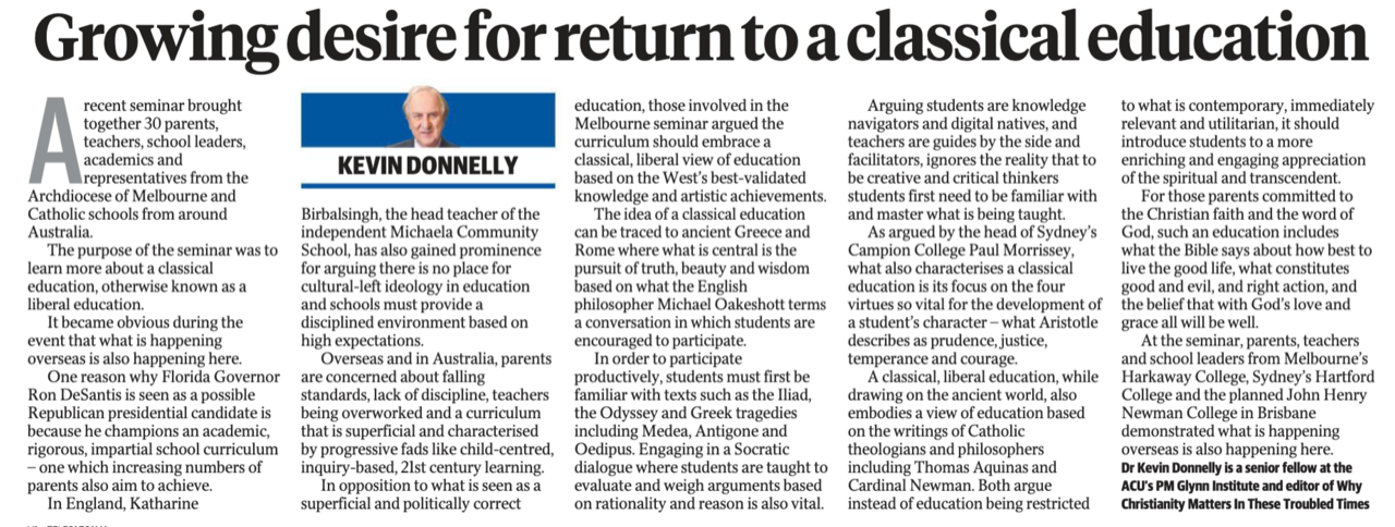 Proven by a recent seminar in Melbourne where 30 parents, teachers, school leaders, academics and representatives from the Archdiocese of Melbourne and Catholic schools came together from around Australia to learn more about what constitutes a classical education, otherwise known as a liberal education, it’s obvious what is happening overseas is also happening here.
