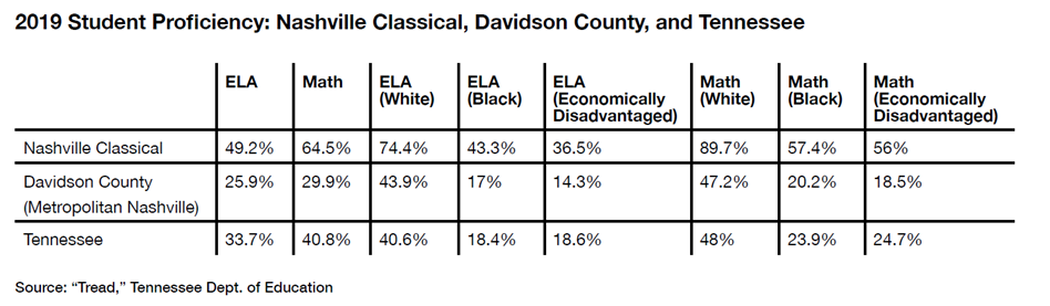 Nashville Classical opened its doors in 2013 in a city where literacy and proficiency rates were consistently below the national average. Its student cohort is diverse, including black, Hispanic and economically disadvantaged backgrounds. 2019 English Language Arts (ELA) proficiency test results show students at Nashville Classical scored 23.3% higher than the most popular metropolitan schools (Davidson County) and 15.5% better than the state average. For mathematics, they were 34.6% better than Davidson County and 23.7% higher than the state average. Students achieved consistently better grades irrespective of their demographic background.