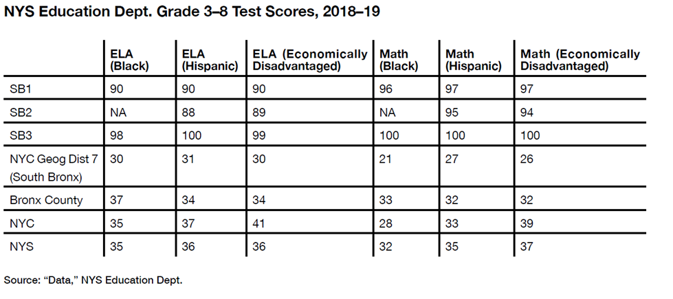South Bronx Classical was specifically established in 2006 to provide some of New York City’s most disadvantaged students with a liberal arts education, in a catchment region that ranks among the state’s lowest counties on mathematics assessment and below average on ELA proficiency. As the table below illustrates, students consistently scored between 55 and 65 marks higher on their ELA and mathematics tests from 1st-3rd year high school and from a range of socio-economic and ethnic backgrounds.