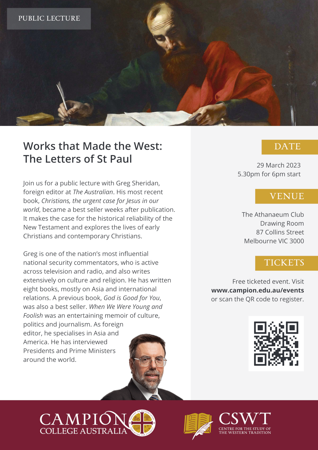 Join us for a public lecture with Greg Sheridan, foreign editor at The Australian. His most recent book, Christians, the urgent case for Jesus in our world, became a best seller weeks after publication. It makes the case for the historical reliability of the New Testament and explores the lives of early Christians and contemporary Christians.